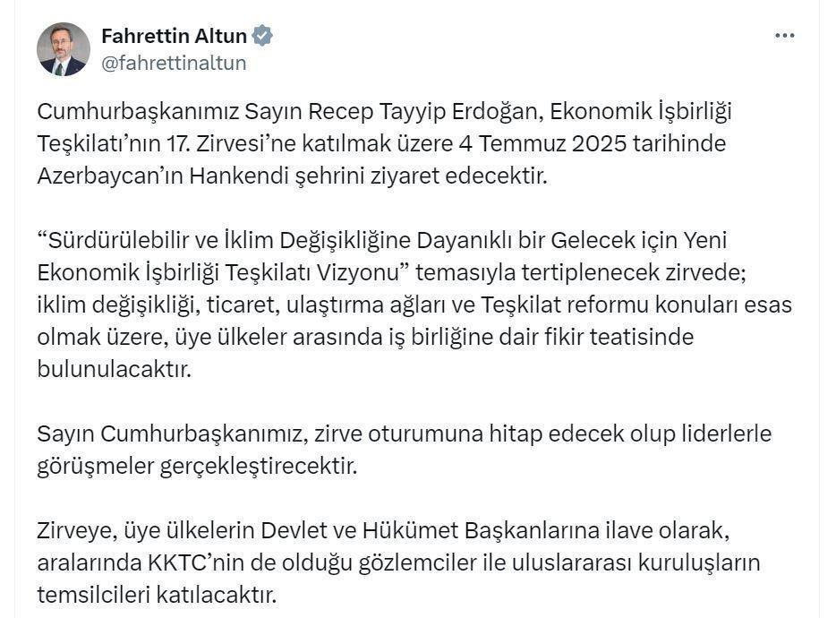 İletişim Başkanı Fahrettin Altun, sosyal medya hesabından yaptığı açıklamada, "Cumhurbaşkanımız Sayın Recep Tayyip Erdoğan, Ekonomik İşbirliği Teşkilatı’nın 17'nci Zirvesi’ne katılmak üzere 4 Temmuz 2025 tarihinde Azerbaycan’ın Hankendi şehrini ziyaret edecektir. 'Sürdürülebilir ve İklim Değişikliğine Dayanıklı bir Gelecek için Yeni Ekonomik İşbirliği Teşkilatı Vizyonu' temasıyla tertiplenecek zirvede; iklim değişikliği, ticaret, ulaştırma ağları ve teşkilat reformu konuları esas olmak üzere, üye ülkeler arasında iş birliğine dair fikir teatisinde bulunulacaktır. Sayın Cumhurbaşkanımız, zirve oturumuna hitap edecek olup liderlerle görüşmeler gerçekleştirecektir. Zirveye, üye ülkelerin devlet ve hükümet başkanlarına ilave olarak, aralarında KKTC’nin de olduğu gözlemciler ile uluslararası kuruluşların temsilcileri katılacaktır" ifadelerini kullandı. (DHA)