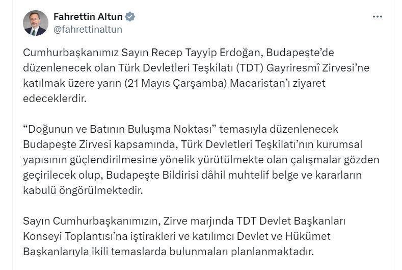 ANKARA, (DHA)- İLETİŞİM Başkanı Fahrettin Altun, Cumhurbaşkanı Recep Tayyip Erdoğan'ın, Budapeşte'de düzenlenecek olan Türk Devletleri Teşkilatı (TDT) Gayriresmi Zirvesi'ne katılmak üzere yarın Macaristan'ı ziyaret edeceğini duyurdu.