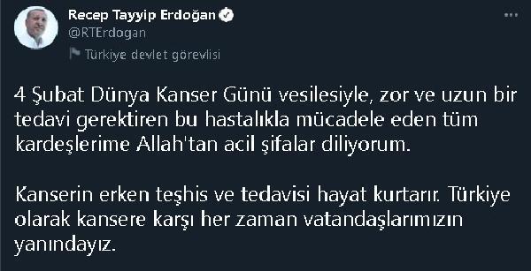 ANKARA, (DHA)- CUMHURBAŞKANI Recep Tayyip Erdoğan, 4 Şubat Dünya Kanser Günü nedeniyle, kanser tedavisi gören vatandaşlara acil şifalar dileyip kansere karşı mücadelede yapılan çalışmaları anlattı.