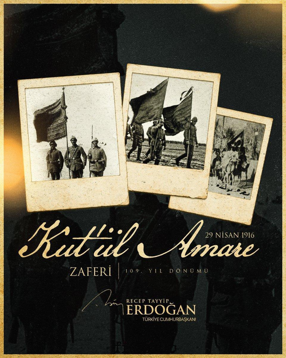 ANKARA, (DHA)- CUMHURBAŞKANI Recep Tayyip Erdoğan, Kut'ül Amare Zaferi'nin 109'uncu yıl dönümüne ilişkin kutlama mesajı paylaştı.