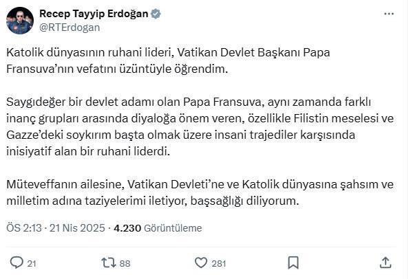 Cumhurbaşkanı Recep Tayyip Erdoğan, "Katolik dünyasının ruhani lideri, Vatikan Devlet Başkanı Papa Fransuva’nın vefatını üzüntüyle öğrendim. Saygıdeğer bir devlet adamı olan Papa Fransuva, aynı zamanda farklı inanç grupları arasında diyaloğa önem veren, özellikle Filistin meselesi ve Gazze’deki soykırım başta olmak üzere insani trajediler karşısında inisiyatif alan bir ruhani liderdi. Müteveffanın ailesine, Vatikan Devleti’ne ve Katolik dünyasına şahsım ve milletim adına taziyelerimi iletiyor, başsağlığı diliyorum" ifadelerini kullandı. (DHA)