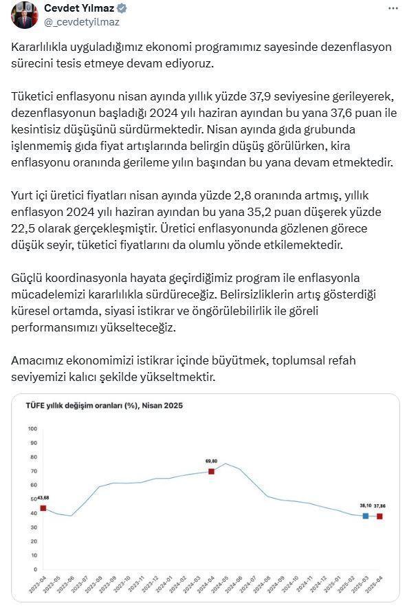 Cumhurbaşkanı Yardımcısı Yılmaz, Türkiye İstatistik Kurumu'nun (TÜİK) açıkladığı Nisan 2025 dönemine ilişkin enflasyon verilerini değerlendirdi. Yılmaz, sosyal medya hesabından yaptığı açıklamada, "Kararlılıkla uyguladığımız ekonomi programımız sayesinde dezenflasyon sürecini tesis etmeye devam ediyoruz. Tüketici enflasyonu nisan ayında yıllık yüzde 37,9 seviyesine gerileyerek, dezenflasyonun başladığı 2024 yılı haziran ayından bu yana 37,6 puan ile kesintisiz düşüşünü sürdürmektedir. Nisan ayında gıda grubunda işlenmemiş gıda fiyat artışlarında belirgin düşüş görülürken, kira enflasyonu oranında gerileme yılın başından bu yana devam etmektedir. Yurt içi üretici fiyatları nisan ayında yüzde 2,8 oranında artmış, yıllık enflasyon 2024 yılı haziran ayından bu yana 35,2 puan düşerek yüzde 22,5 olarak gerçekleşmiştir. Üretici enflasyonunda gözlenen görece düşük seyir, tüketici fiyatlarını da olumlu yönde etkilemektedir. Güçlü koordinasyonla hayata geçirdiğimiz program ile enflasyonla mücadelemizi kararlılıkla sürdüreceğiz. Belirsizliklerin artış gösterdiği küresel ortamda, siyasi istikrar ve öngörülebilirlik ile göreli performansımızı yükselteceğiz. Amacımız ekonomimizi istikrar içinde büyütmek, toplumsal refah seviyemizi kalıcı şekilde yükseltmekti. Belirsizliklerin artış gösterdiği küresel ortamda, siyasi istikrar ve öngörülebilirlik ile göreli performansımızı yükselteceğiz. Amacımız ekonomimizi istikrar içinde büyütmek, toplumsal refah seviyemizi kalıcı şekilde yükseltmektir" ifadelerini kullandı. (DHA)