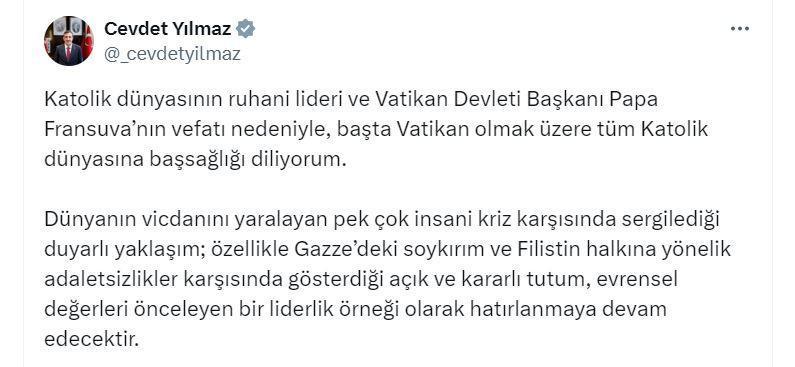 Cevdet Yılmaz, "Katolik dünyasının ruhani lideri ve Vatikan Devleti Başkanı Papa Fransuva'nın vefatı nedeniyle, başta Vatikan olmak üzere tüm Katolik dünyasına başsağlığı diliyorum. Dünyanın vicdanını yaralayan pek çok insani kriz karşısında sergilediği duyarlı yaklaşım; özellikle Gazze'deki soykırım ve Filistin halkına yönelik adaletsizlikler karşısında gösterdiği açık ve kararlı tutum, evrensel değerleri önceleyen bir liderlik örneği olarak hatırlanmaya devam edecektir" ifadelerini kullandı. (DHA)