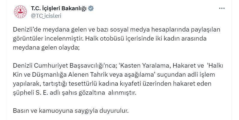İçişleri Bakanlığı, Denizli'de iki yolcunun kavga ettiği olaya ilişkin sosyal medya hesabından açıklama yaptı. Açıklamada, "Denizli'de meydana gelen ve bazı sosyal medya hesaplarında paylaşılan görüntüler incelenmiştir. Halk otobüsü içerisinde iki kadın arasında meydana gelen olayda; Denizli Cumhuriyet Başsavcılığı'nca; 'Kasten yaralama, hakaret ve halkı kin ve düşmanlığa alenen tahrik veya aşağılama' suçundan adli işlem yapılarak, tartıştığı tesettürlü kadına kıyafeti üzerinden hakaret eden şüpheli S.E.adlı şahıs gözaltına alınmıştır" denildi. (DHA)