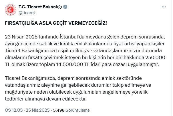 Bakanlığın sosyal medya hesabından yapılan açıklamada, "23 Nisan 2025 tarihinde İstanbul'da meydana gelen deprem sonrasında, aynı gün içinde satılık ve kiralık emlak ilanlarında fiyat artışı yapan kişiler, Ticaret Bakanlığımızca tespit edilmiş ve vatandaşlarımızın zor durumda olmalarını fırsata çevirmek isteyen bu kişilerin her biri hakkında 250 bin TL olmak üzere toplam 14 milyon 500 bin TL idari para cezası uygulanmıştır. Ticaret Bakanlığımızca, deprem sonrasında emlak sektöründe vatandaşlarımız aleyhine gelişebilecek durumlar takip edilmeye ve mağduriyete neden olabilecek uygulamaları engellemeye yönelik tedbirler alınmaya devam edilecektir" denildi. (DHA)