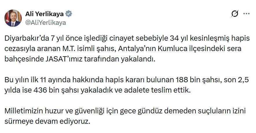 Umutcan ÖREN/ANKARA, (DHA)- İÇİŞLERİ Bakanı Ali Yerlikaya, Diyarbakır’da 7 yıl önce işlenen cinayete ilişkin 34 yıl kesinleşmiş hapis cezasıyla aranan M.T.'nin, Jandarma Suç Araştırma Timi (JASAT) tarafından Antalya'nın Kumluca ilçesinde yakalandığını açıkladı.
