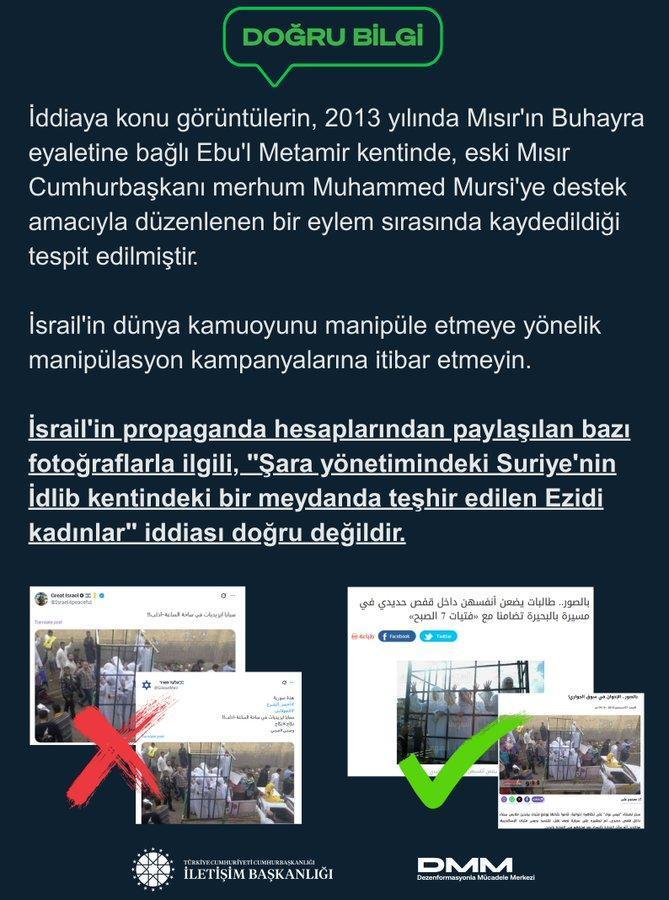 DMM’nin sosyal medya hesabından yapılan paylaşımda, “İsrail'in propaganda hesaplarından paylaşılan bazı fotoğraflarla ilgili, ‘Şara yönetimindeki Suriye'nin İdlib kentindeki bir meydanda teşhir edilen Ezidi kadınlar’ iddiası doğru değildir. İddiaya konu görüntülerin, 2013 yılında Mısır'ın Buhayra eyaletine bağlı Ebu'l Metamir kentinde, eski Mısır Cumhurbaşkanı merhum Muhammed Mursi'ye destek amacıyla düzenlenen bir eylem sırasında kaydedildiği tespit edilmiştir. İsrail'in dünya kamuoyunu manipüle etmeye yönelik manipülasyon kampanyalarına itibar etmeyin” ifadelerine yer verildi. (DHA)