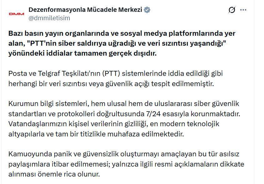 DMM'nin sanal medya hesabından yapılan açıklamada, "Bazı basın yayın organlarında ve sosyal medya platformlarında yer alan, 'PTT'nin siber saldırıya uğradığı ve veri sızıntısı yaşandığı' yönündeki iddialar tamamen gerçek dışıdır. Posta ve Telgraf Teşkilatı'nın (PTT) sistemlerinde iddia edildiği gibi herhangi bir veri sızıntısı veya güvenlik açığı tespit edilmemiştir. Kurumun bilgi sistemleri, hem ulusal hem de uluslararası siber güvenlik standartları ve protokolleri doğrultusunda 7/24 esasıyla korunmaktadır. Vatandaşlarımızın kişisel verilerinin gizliliği, en modern teknolojik altyapılarla ve tam bir titizlikle muhafaza edilmektedir. Kamuoyunda panik ve güvensizlik oluşturmayı amaçlayan bu tür asılsız paylaşımlara itibar edilmemesi; yalnızca ilgili resmi açıklamaların dikkate alınması önemle rica olunur" denildi. (DHA)