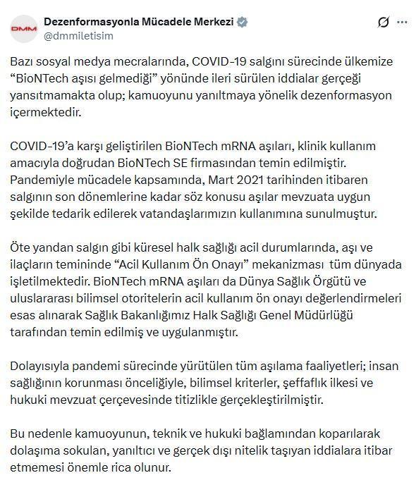 DMM'nin sosyal medya hesabından yapılan açıklamada, “Bazı sosyal medya mecralarında, COVID-19 salgını sürecinde ülkemize 'BioNTech aşısı gelmediği' yönünde ileri sürülen iddialar gerçeği yansıtmamakta olup; kamuoyunu yanıltmaya yönelik dezenformasyon içermektedir. COVID-19’a karşı geliştirilen BioNTech mRNA aşıları, klinik kullanım amacıyla doğrudan BioNTech SE firmasından temin edilmiştir. Pandemiyle mücadele kapsamında, Mart 2021 tarihinden itibaren salgının son dönemlerine kadar söz konusu aşılar mevzuata uygun şekilde tedarik edilerek vatandaşlarımızın kullanımına sunulmuştur. Öte yandan salgın gibi küresel halk sağlığı acil durumlarında, aşı ve ilaçların temininde 'acil kullanım ön onayı' mekanizması tüm dünyada işletilmektedir. BioNTech mRNA aşıları da Dünya Sağlık Örgütü ve uluslararası bilimsel otoritelerin acil kullanım ön onayı değerlendirmeleri esas alınarak Sağlık Bakanlığı'mız Halk Sağlığı Genel Müdürlüğü tarafından temin edilmiş ve uygulanmıştır. Dolayısıyla pandemi sürecinde yürütülen tüm aşılama faaliyetleri; insan sağlığının korunması önceliğiyle, bilimsel kriterler, şeffaflık ilkesi ve hukuki mevzuat çerçevesinde titizlikle gerçekleştirilmiştir. Bu nedenle kamuoyunun, teknik ve hukuki bağlamından koparılarak dolaşıma sokulan, yanıltıcı ve gerçek dışı nitelik taşıyan iddialara itibar etmemesi önemle rica olunur" ifadelerine yer verildi. (DHA)