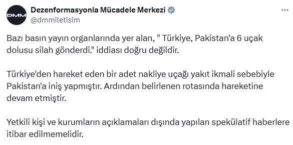 ANKARA, (DHA)- İLETİŞİM Başkanlığı Dezenformasyonla Mücadele Merkezi’nden (DMM) yapılan açıklamada, “Bazı basın yayın organlarında yer alan, ‘Türkiye, Pakistan'a 6 uçak dolusu silah gönderdi' iddiası doğru değildir” denildi.