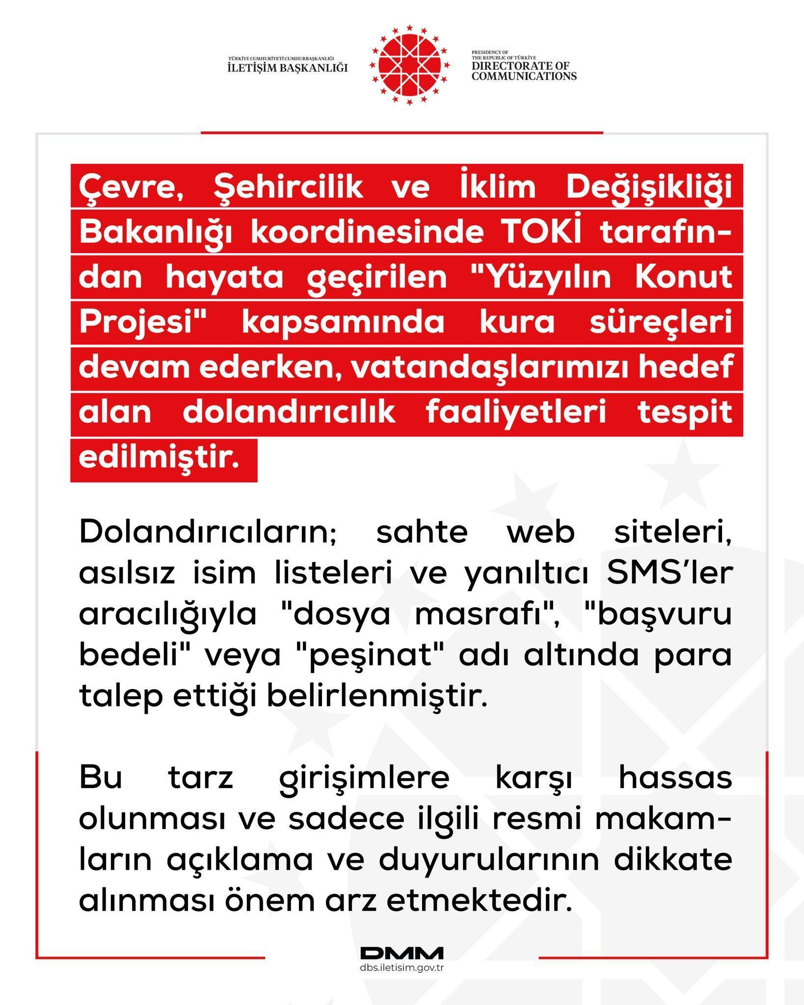 DMM'nin sanal medya hesabından yapılan açıklamada, "Çevre, Şehircilik ve İklim Değişikliği Bakanlığı koordinesinde TOKİ tarafından hayata geçirilen 'Yüzyılın Konut Projesi' kapsamında kura süreçleri devam ederken, vatandaşlarımızı hedef alan dolandırıcılık faaliyetleri tespit edilmiştir. Dolandırıcıların; sahte web siteleri, asılsız isim listeleri ve yanıltıcı SMS'ler aracılığıyla 'dosya masrafı', 'başvuru bedeli' veya 'peşinat' adı altında para talep ettiği belirlenmiştir. Bu tarz girişimlere karşı hassas olunması ve sadece ilgili resmi makamların açıklama ve duyurularının dikkate alınması önem arz etmektedir. Kura sonuçları yalnızca turkiye.gov.tr (e-Devlet) ve toki.gov.tr resmi adreslerinden sorgulanabilir. TOKİ, vatandaşlardan SMS veya telefon yoluyla hiçbir şekilde şahsi hesaplara para transferi talep etmez. Tüm ödeme ve sözleşme işlemleri sadece duyurulan yetkili kamu bankaları üzerinden, şahsen gerçekleştirilmektedir. ‘Kura sonucunuz çıktı’, ‘Ödeme yapmak için tıklayın’ gibi ifadeler içeren şüpheli SMS linklerine ve resmi kurumları taklit eden web sitelerine itibar etmeyiniz. Dolandırıcılık girişimlerine karşı dikkatli olunması ve şüpheli durumların 112 Acil Çağrı Merkezi veya en yakın emniyet birimine bildirilmesi önem arz etmektedir. Resmi makamların açıklamaları dışında sosyal medya platformlarında paylaşılan ‘asil/yedek isim listeleri’ gerçek değildir" denildi. (DHA)