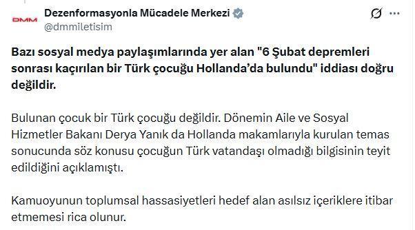 DMM'nin sanal medya hesabından yapılan açıklamada, "Bazı sosyal medya paylaşımlarında yer alan '6 Şubat depremleri sonrası kaçırılan bir Türk çocuğu Hollanda'da bulundu' iddiası doğru değildir. Bulunan çocuk bir Türk çocuğu değildir. Dönemin Aile ve Sosyal Hizmetler Bakanı Derya Yanık da Hollanda makamlarıyla kurulan temas sonucunda söz konusu çocuğun Türk vatandaşı olmadığı bilgisinin teyit edildiğini açıklamıştı. Kamuoyunun toplumsal hassasiyetleri hedef alan asılsız içeriklere itibar etmemesi rica olunur" denildi. (DHA)
