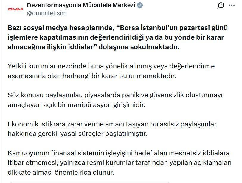 DMM'nin sanal medya hesabından yapılan açıklamada, "Bazı sosyal medya hesaplarında, 'Borsa İstanbul'un pazartesi günü işlemlere kapatılmasının değerlendirildiği ya da bu yönde bir karar alınacağına ilişkin iddialar' dolaşıma sokulmaktadır. Yetkili kurumlar nezdinde buna yönelik alınmış veya değerlendirme aşamasında olan herhangi bir karar bulunmamaktadır. Söz konusu paylaşımlar, piyasalarda panik ve güvensizlik oluşturmayı amaçlayan açık bir manipülasyon girişimidir. Ekonomik istikrara zarar verme amacı taşıyan bu asılsız paylaşımlar hakkında gerekli yasal süreçler başlatılmıştır. Kamuoyunun finansal sistemin işleyişini hedef alan mesnetsiz iddialara itibar etmemesi; yalnızca resmi kurumlar tarafından yapılan açıklamaları dikkate alması önemle rica olunur" ifadelerine yer verildi. (DHA)