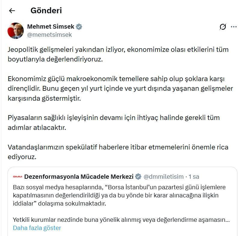 Hazine ve Maliye Bakanı Mehmet Şimşek de DMM'nin paylaşımını alıntılayarak, konuya ilişkin sanal medya hesabından açıklama yaptı. Şimşek, "Jeopolitik gelişmeleri yakından izliyor, ekonomimize olası etkilerini tüm boyutlarıyla değerlendiriyoruz. Ekonomimiz güçlü makroekonomik temellere sahip olup şoklara karşı dirençlidir. Bunu geçen yıl yurt içinde ve yurt dışında yaşanan gelişmeler karşısında göstermiştir. Piyasaların sağlıklı işleyişinin devamı için ihtiyaç halinde gerekli tüm adımlar atılacaktır. Vatandaşlarımızın spekülatif haberlere itibar etmemelerini önemle rica ediyoruz" ifadelerini kullandı. (DHA)