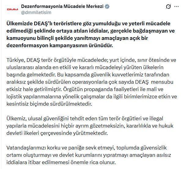 DMM'nin sanal medya hesabından yapılan açıklamada, "Ülkemizde DEAŞ'lı teröristlere göz yumulduğu ve yeterli mücadele edilmediği şeklinde ortaya atılan iddialar, gerçekle bağdaşmayan ve kamuoyunu bilinçli şekilde yanıltmayı amaçlayan açık bir dezenformasyon kampanyasının ürünüdür. Türkiye, DEAŞ terör örgütüyle mücadelede; yurt içinde, sınır ötesinde ve uluslararası alanda en etkili ve kararlı mücadeleyi yürüten ülkelerin başında gelmektedir. Bu kapsamda güvenlik kuvvetlerimiz tarafından aralıksız şekilde sürdürülen operasyonlarla çok sayıda DEAŞ mensubu etkisiz hale getirilmiştir. Örgütün propaganda faaliyetleri ile mali ve lojistik yapılanmalarına yönelik çalışmalar da ilgili birimlerimizce etkin ve kesintisiz biçimde sürdürülmektedir. Ülkemiz, ulusal güvenliğini tehdit eden tüm terör örgütleri ve illegal yapılarla mücadelesini hiçbir ayrım gözetmeksizin, kararlılıkla ve hukuk devleti ilkeleri çerçevesinde yürütmektedir. Vatandaşlarımızı korku ve paniğe sevk etmeyi, toplumda güvensizlik ortamı oluşturmayı ve devlet kurumlarını yıpratmayı amaçlayan asılsız iddialara itibar edilmemesi önemle rica olunur" ifadelerine yer verildi. (DHA)