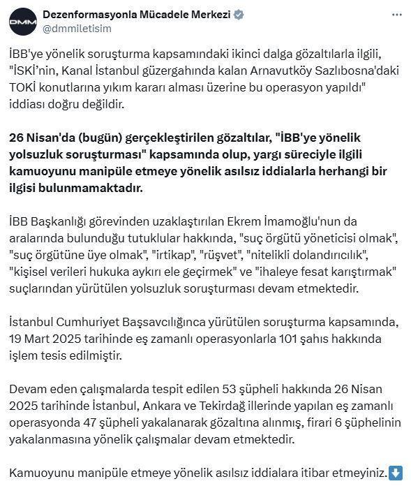 "İBB'ye yönelik soruşturma kapsamındaki ikinci dalga gözaltılarla ilgili, 'İSKİ'nin (İstanbul Su ve Kanalizasyon İdaresi), Kanal İstanbul güzergahında kalan Arnavutköy Sazlıbosna'daki TOKİ (Toplu Konut İdaresi) konutlarına yıkım kararı alması üzerine bu operasyon yapıldı' iddiası doğru değildir. 26 Nisan'da gerçekleştirilen gözaltılar, 'İBB'ye yönelik yolsuzluk soruşturması' kapsamında olup, yargı süreciyle ilgili kamuoyunu manipüle etmeye yönelik asılsız iddialarla herhangi bir ilgisi bulunmamaktadır. İBB Başkanlığı görevinden uzaklaştırılan Ekrem İmamoğlu'nun da aralarında bulunduğu tutuklular hakkında, 'Suç örgütü yöneticisi olmak', 'Suç örgütüne üye olmak', 'İrtikap', 'Rüşvet', 'Nitelikli dolandırıcılık', 'Kişisel verileri hukuka aykırı ele geçirmek' ve 'İhaleye fesat karıştırmak' suçlarından yürütülen yolsuzluk soruşturması devam etmektedir. İstanbul Cumhuriyet Başsavcılığı'nca yürütülen soruşturma kapsamında, 19 Mart 2025 tarihinde eş zamanlı operasyonlarla 101 şahıs hakkında işlem tesis edilmiştir. Devam eden çalışmalarda tespit edilen 53 şüpheli hakkında 26 Nisan 2025 tarihinde İstanbul, Ankara ve Tekirdağ illerinde yapılan eş zamanlı operasyonda 47 şüpheli yakalanarak gözaltına alınmış, firari 6 şüphelinin yakalanmasına yönelik çalışmalar devam etmektedir. Kamuoyunu manipüle etmeye yönelik asılsız iddialara itibar etmeyiniz." (DHA)