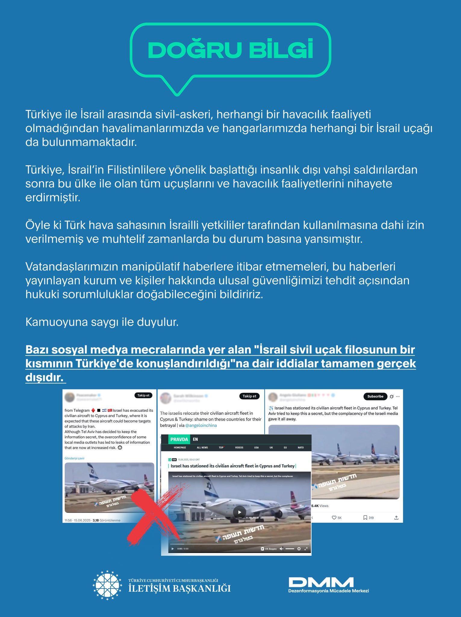 Dezenformasyonla Mücadele Merkezi (DMM), sosyal medya hesabından yaptığı paylaşımda, bazı sosyal medya mecralarında yer alan ‘İsrail sivil uçak filosunun bir kısmının Türkiye'de konuşlandırıldığına dair iddiaların doğru olmadığını açıkladı. Yapılan açıklamada, “Türkiye ile İsrail arasında sivil-askeri, herhangi bir havacılık faaliyeti olmadığından havalimanlarımızda ve hangarlarımızda herhangi bir İsrail uçağı da bulunmamaktadır. Türkiye, İsrail’in Filistinlilere yönelik başlattığı insanlık dışı vahşi saldırılardan sonra bu ülke ile olan tüm uçuşlarını ve havacılık faaliyetlerini nihayete erdirmiştir. Öyle ki Türk hava sahasının İsrailli yetkililer tarafından kullanılmasına dahi izin verilmemiş ve muhtelif zamanlarda bu durum basına yansımıştır. Vatandaşlarımızın manipülatif haberlere itibar etmemeleri, bu haberleri yayınlayan kurum ve kişiler hakkında ulusal güvenliğimizi tehdit açısından hukuki sorumluluklar doğabileceğini bildiririz” ifadeleri kullanıldı. (DHA)