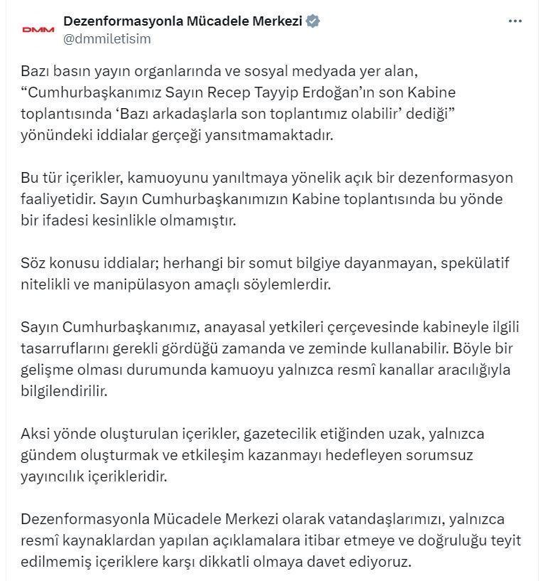 DMM'nin sosyal medya hesabından yapılan açıklamada, "Bazı basın yayın organlarında ve sosyal medyada yer alan, Cumhurbaşkanımız Sayın Recep Tayyip Erdoğan'ın son Kabine toplantısında 'Bazı arkadaşlarla son toplantımız olabilir' dediği yönündeki iddialar gerçeği yansıtmamaktadır. Bu tür içerikler, kamuoyunu yanıltmaya yönelik açık bir dezenformasyon faaliyetidir. Sayın Cumhurbaşkanımızın Kabine toplantısında bu yönde bir ifadesi kesinlikle olmamıştır. Söz konusu iddialar; herhangi bir somut bilgiye dayanmayan, spekülatif nitelikli ve manipülasyon amaçlı söylemlerdir" denildi.