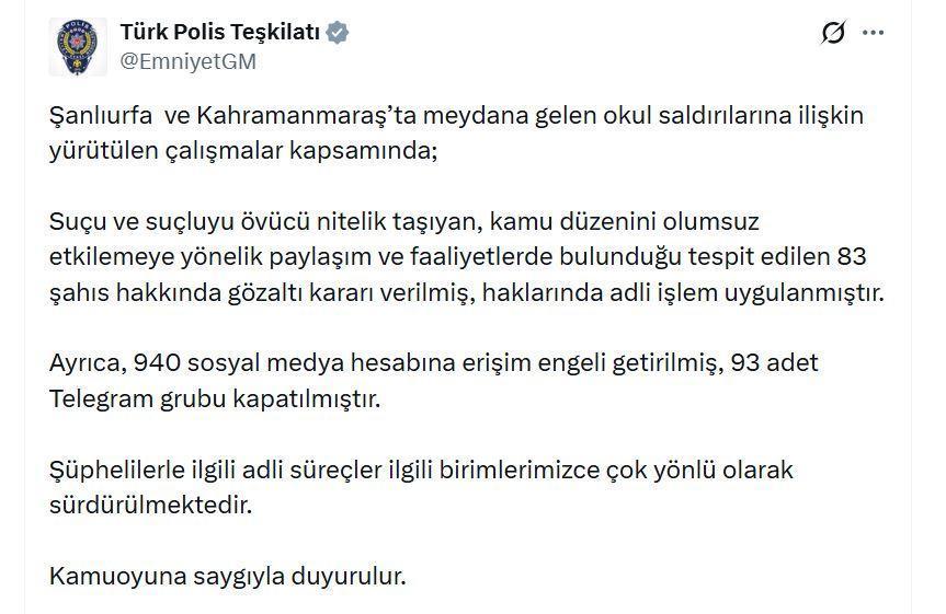 EGM'nin sanal medya hesabından yapılan açıklamada, "Şanlıurfa ve Kahramanmaraş’ta meydana gelen okul saldırılarına ilişkin yürütülen çalışmalar kapsamında; suçu ve suçluyu övücü nitelik taşıyan, kamu düzenini olumsuz etkilemeye yönelik paylaşım ve faaliyetlerde bulunduğu tespit edilen 83 şahıs hakkında gözaltı kararı verilmiş, haklarında adli işlem uygulanmıştır. Ayrıca, 940 sosyal medya hesabına erişim engeli getirilmiş, 93 adet Telegram grubu kapatılmıştır. Şüphelilerle ilgili adli süreçler ilgili birimlerimizce çok yönlü olarak sürdürülmektedir" denildi. (DHA)