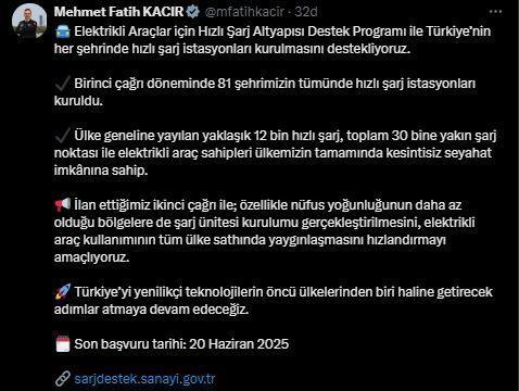 ANKARA, (DHA)- SANAYİ ve Teknoloji Bakanı Mehmet Fatih Kacır, elektrikli araç kullanımının yaygınlaştırılması ve Türkiye’nin sürdürülebilir ulaşım hedeflerine katkı sağlanması amacıyla 'Elektrikli Araçlar Hızlı Şarj Altyapısı Destek Programı 2'nci Çağrısı' kapsamında yeni başvuru döneminin başladığını duyurdu.