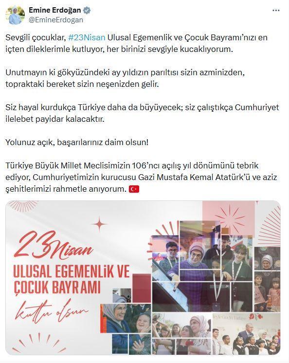 ANKARA, (DHA)- CUMHURBAŞKANI Recep Tayyip Erdoğan'ın eşi Emine Erdoğan, "Sevgili çocuklar, 23 Nisan Ulusal Egemenlik ve Çocuk Bayramı’nızı en içten dileklerimle kutluyor, her birinizi sevgiyle kucaklıyorum" dedi.