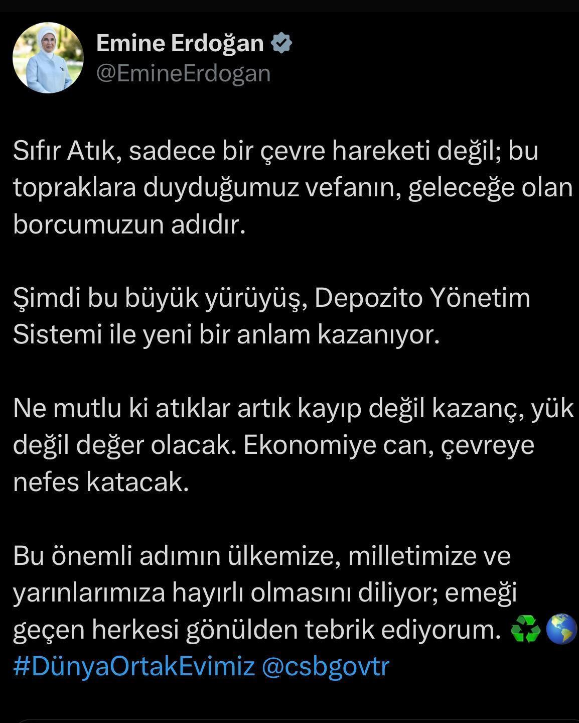 ANKARA, (DHA)- CUMHURBAŞKANI Recep Tayyip Erdoğan'ın eşi Emine Erdoğan, Sıfır Atık hareketi kapsamında hayata geçirilen Depozito Yönetim Sistemi'ne ilişkin paylaşımda bulundu.