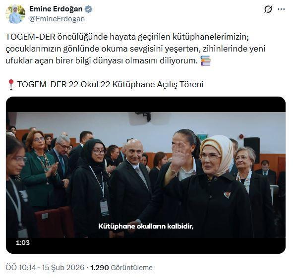 ANKARA, (DHA)- CUMHURBAŞKANI Recep Tayyip Erdoğan'ın eşi Emine Erdoğan, Toplumsal Gelişim Merkezi Eğitim ve Sosyal Dayanışma Derneği'nin (TOGEM-DER) '22 Okula 22 Kütüphane' programına ilişkin paylaşım yaptı.