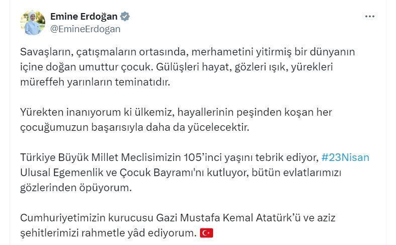 Emine Erdoğan, 23 Nisan Ulusal Egemenlik ve Çocuk Bayramı nedeniyle sosyal medya hesabından yayımladığı mesajında, şunları kaydetti: