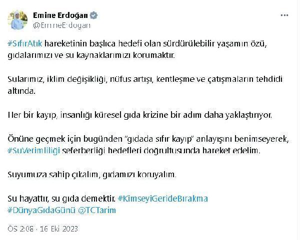 ANKARA, (DHA)- CUMHURBAŞKANI Recep Tayyip Erdoğan'ın eşi Emine Erdoğan, 16 Ekim Dünya Gıda Günü mesajında, "Suyumuza sahip çıkalım, gıdamızı koruyalım. Su hayattır, su gıda demektir" dedi.