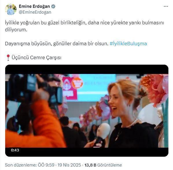 Emine Erdoğan, sosyal medya hesabından yaptığı paylaşımda, "İyilikle yoğrulan bu güzel birlikteliğin, daha nice yürekte yankı bulmasını diliyorum. Dayanışma büyüsün, gönüller daima bir olsun" dedi. (DHA)