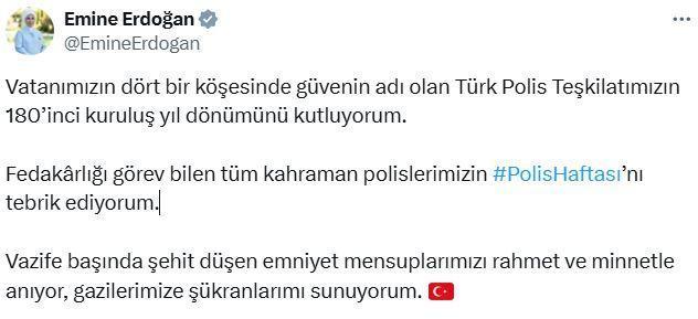 ANKARA, (DHA)- CUMHURBAŞKANI Recep Tayyip Erdoğan'ın eşi Emine Erdoğan, Türk Polis Teşkilatı'nın 180'inci kuruluş yıl dönümü dolayısıyla mesaj paylaştı.