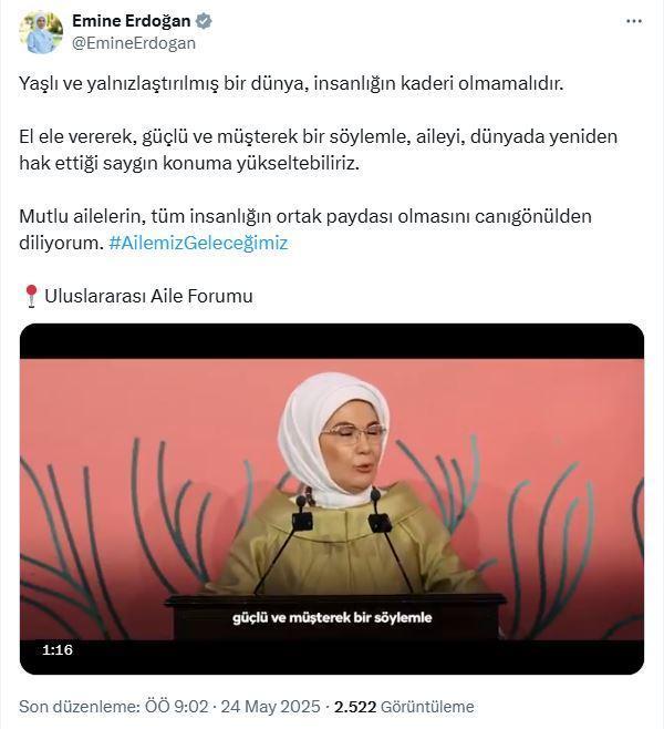ANKARA, (DHA)- CUMHURBAŞKANI Recep Tayyip Erdoğan'ın eşi Emine Erdoğan, İstanbul'da düzenlenen Uluslararası Aile Forumu'na ilişkin paylaşım yaptı.