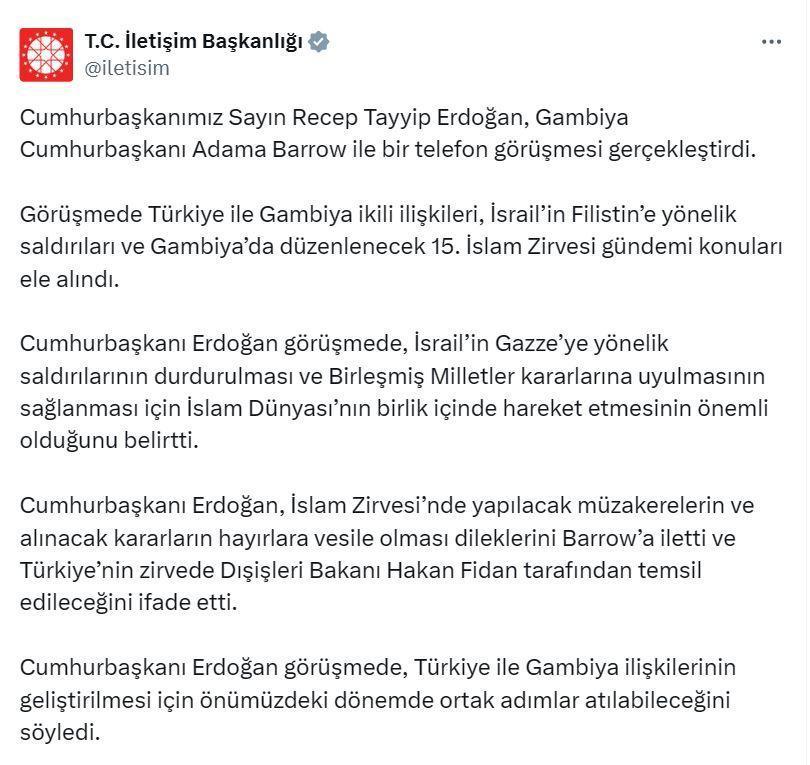 Görüşmede Türkiye ile Gambiya ikili ilişkileri, İsrail’in Filistin’e yönelik saldırıları ve Gambiya’da düzenlenecek 15'inci İslam Zirvesi gündemi konuları ele alındı. İletişim Başkanlığı’ndan yapılan açıklamada, "Cumhurbaşkanı Erdoğan görüşmede, İsrail’in Gazze’ye yönelik saldırılarının durdurulması ve Birleşmiş Milletler kararlarına uyulmasının sağlanması için İslam Dünyası’nın birlik içinde hareket etmesinin önemli olduğunu belirtti. Cumhurbaşkanı Erdoğan, İslam Zirvesi’nde yapılacak müzakerelerin ve alınacak kararların hayırlara vesile olması dileklerini Barrow’a iletti ve Türkiye’nin zirvede Dışişleri Bakanı Hakan Fidan tarafından temsil edileceğini ifade etti. Cumhurbaşkanı Erdoğan görüşmede, Türkiye ile Gambiya ilişkilerinin geliştirilmesi için önümüzdeki dönemde ortak adımlar atılabileceğini söyledi" denildi. (DHA)