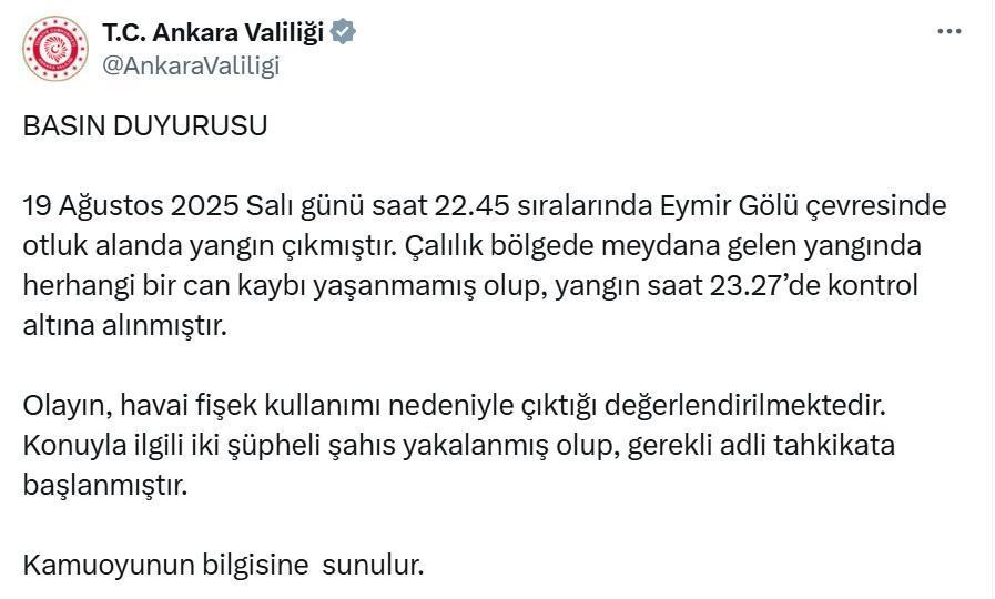 Ankara Valiliği'nin sosyal medya hesabından yapılan açıklamada, "19 Ağustos 2025 Salı günü saat 22.45 sıralarında Eymir Gölü çevresinde otluk alanda yangın çıkmıştır. Çalılık bölgede meydana gelen yangında herhangi bir can kaybı yaşanmamış olup, yangın saat 23.27’de kontrol altına alınmıştır. Olayın, havai fişek kullanımı nedeniyle çıktığı değerlendirilmektedir. Konuyla ilgili iki şüpheli yakalanmış olup, gerekli adli tahkikata başlanmıştır" denildi. (DHA)