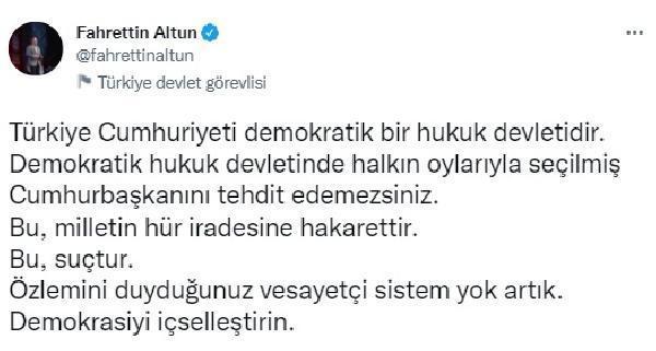 İletişim Başkanı Altun, Twitter hesabından yaptığı açıklamada "Türkiye Cumhuriyeti demokratik bir hukuk devletidir. Demokratik hukuk devletinde halkın oylarıyla seçilmiş Cumhurbaşkanını tehdit edemezsiniz. Bu, milletin hür iradesine hakarettir. Bu, suçtur. Özlemini duyduğunuz vesayetçi sistem yok artık. Demokrasiyi içselleştirin" ifadelerini kaydetti. (DHA)