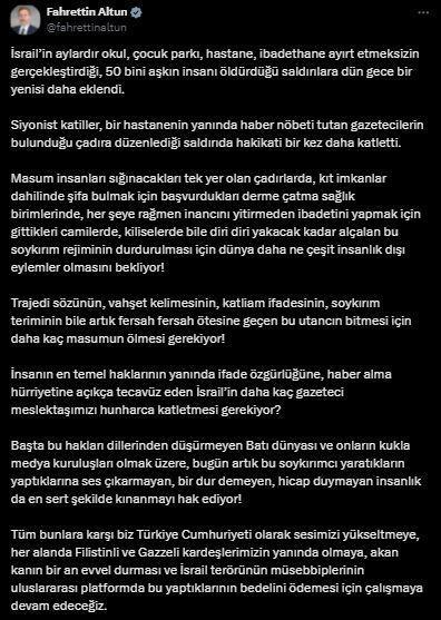 Batı dünyasının İsrail'in saldırılarına ses çıkarmadığını aktaran Fahrettin Altun, "'Trajedi' sözünün, 'vahşet' kelimesinin, 'katliam' ifadesinin, 'soykırım' teriminin bile artık fersah fersah ötesine geçen bu utancın bitmesi için daha kaç masumun ölmesi gerekiyor? İnsanın en temel haklarının yanında ifade özgürlüğüne, haber alma hürriyetine açıkça tecavüz eden İsrail'in daha kaç gazeteci meslektaşımızı hunharca katletmesi gerekiyor? Başta bu hakları dillerinden düşürmeyen Batı dünyası ve onların kukla medya kuruluşları olmak üzere, bugün artık bu soykırımcı yaratıkların yaptıklarına ses çıkarmayan, bir 'dur' demeyen, hicap duymayan insanlık da en sert şekilde kınanmayı hak ediyor. Tüm bunlara karşı biz Türkiye Cumhuriyeti olarak sesimizi yükseltmeye, her alanda Filistinli ve Gazzeli kardeşlerimizin yanında olmaya, akan kanın bir an evvel durması ve İsrail terörünün müsebbiplerinin uluslararası platformda bu yaptıklarının bedelini ödemesi için çalışmaya devam edeceğiz" ifadelerini kullandı. (DHA)