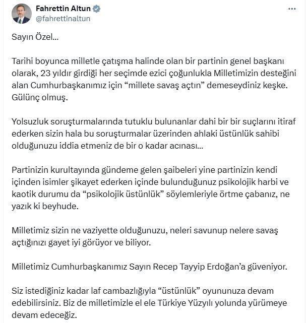 İletişim Başkanı Fahrettin Altun, CHP Genel Başkanı Özgür Özel'in Cumhurbaşkanı Recep Tayyip Erdoğan'a yönelik eleştirilerine sosyal medya hesabından yaptığı açıklama ile yanıt verdi. Altun, "Sayın Özel; tarihi boyunca milletle çatışma halinde olan bir partinin genel başkanı olarak, 23 yıldır girdiği her seçimde ezici çoğunlukla milletimizin desteğini alan Cumhurbaşkanımız için 'millete savaş açtın' demeseydiniz keşke, gülünç olmuş. Yolsuzluk soruşturmalarında tutuklu bulunanlar dahi bir bir suçlarını itiraf ederken sizin hala bu soruşturmalar üzerinden ahlaki üstünlük sahibi olduğunuzu iddia etmeniz de bir o kadar acınası. Partinizin kurultayında gündeme gelen şaibeleri yine partinizin kendi içinden isimler şikayet ederken içinde bulunduğunuz psikolojik harbi ve kaotik durumu da 'psikolojik üstünlük' söylemleriyle örtme çabanız, ne yazık ki beyhude" ifadelerini kullandı.