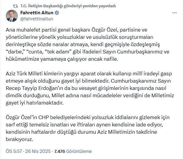 İletişim Başkanı Fahrettin Altun, sosyal medya hesabından yaptığı açıklamada, "Ana muhalefet partisi genel başkanı Özgür Özel, partisine ve yöneticilerine yönelik yolsuzluklar ve usulsüzlük soruşturmaları derinleştikçe sözde naralar atmaya, kendi geçmişiyle özdeşleşmiş 'darbe', 'cunta', 'tek adam' gibi ifadeleri Sayın Cumhurbaşkanımız ve hükümetimize yamamaya çalışıyor ancak nafile. Aziz Türk milleti kimlerin yargıyı aparat olarak kullanıp milli iradeyi gasp etmeye alışık olduğunu gayet iyi bilmektedir. Cumhurbaşkanımız Sayın Recep Tayyip Erdoğan'ın da bu vesayet girişimlerinin karşısında nasıl dimdik durduğunu, millet adına nasıl mücadeleler verdiğini de milletimiz gayet iyi hatırlamaktadır. Özgür Özel'in CHP belediyelerindeki yolsuzluk iddialarını gizlemek için sarf ettiği temelsiz isnatları ve iftiraları aynen kendisine iade ediyor, kendisinin haftalardır düştüğü durumu aziz milletimizin takdirine bırakıyoruz" ifadelerini kullandı. (DHA)
