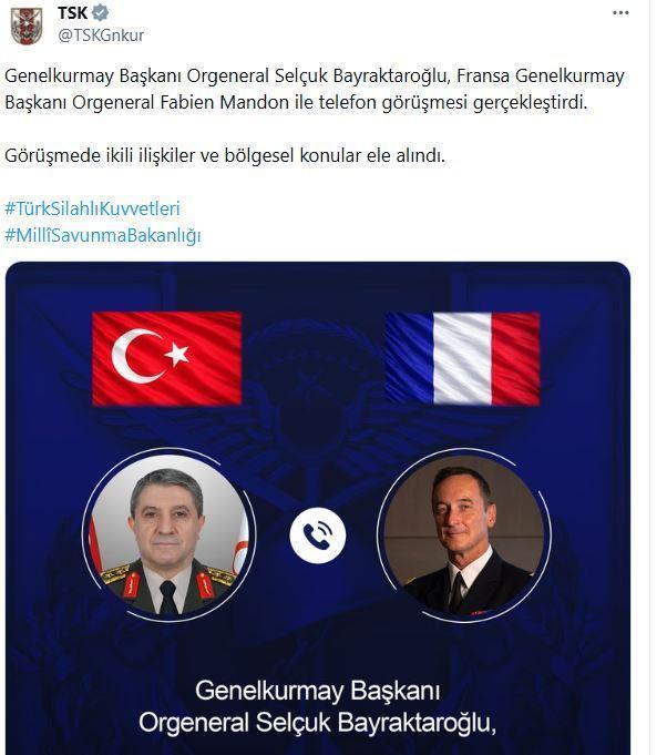 Türk Silahlı Kuvvetleri'nin (TSK) sanal medya hesabından yapılan açıklamada, "Genelkurmay Başkanı Orgeneral Selçuk Bayraktaroğlu, Fransa Genelkurmay Başkanı Orgeneral Fabien Mandon ile telefon görüşmesi gerçekleştirdi. Görüşmede ikili ilişkiler ve bölgesel konular ele alındı" denildi. (DHA)