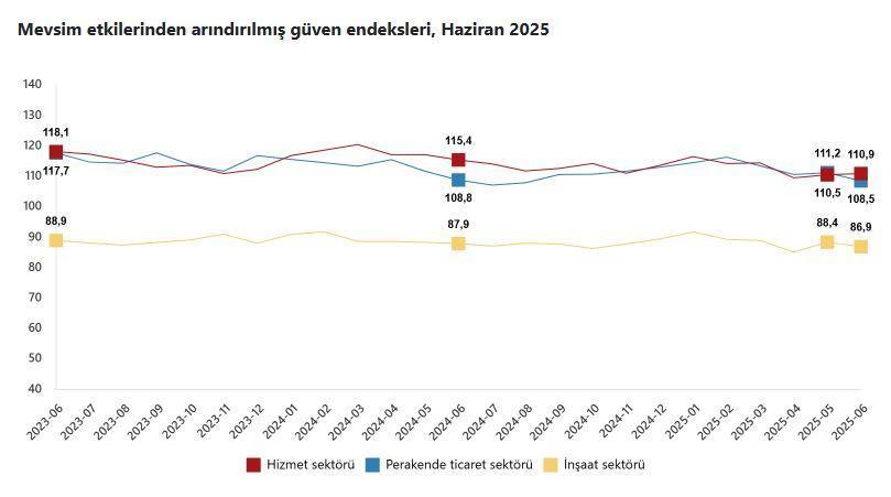 TÜİK, Haziran 2025 dönemine ilişkin hizmet, perakende ticaret ve inşaat güven endekslerini açıkladı. Buna göre; güven endeksi haziran ayında bir önceki aya göre; hizmet sektöründe yüzde 0,4 oranında artarak 110,9 değerini, perakende ticaret sektöründe yüzde 2,5 oranında azalarak 108,5 değerini ve inşaat sektöründe yüzde 1,7 oranında azalarak 86,9 değerini aldı. (DHA)