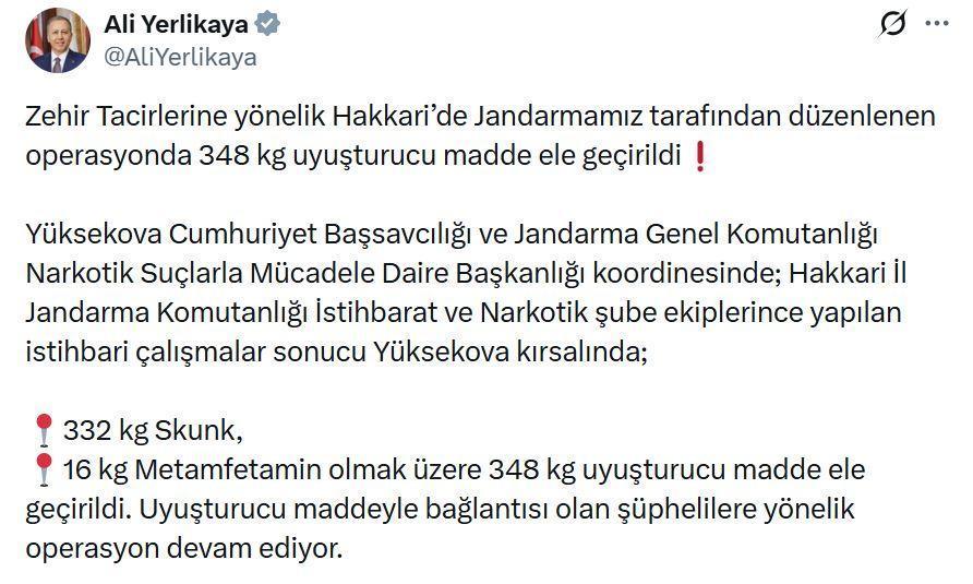 İçişleri Bakanı Yerlikaya, jandarma tarafından düzenlenen narkotik operasyonunu sanal medya hesabından duyurdu. Yüksekova Cumhuriyet Başsavcılığı koordinesinde yapılan istihbarı çalışmalar kapsamında düzenlenen operasyonda, Yüksekova kırsalında 332 kilogram skunk, 16 kilogram metamfetamin olmak üzere 348 kilogram uyuşturucu madde ele geçirildi. Operasyon devam ediyor.