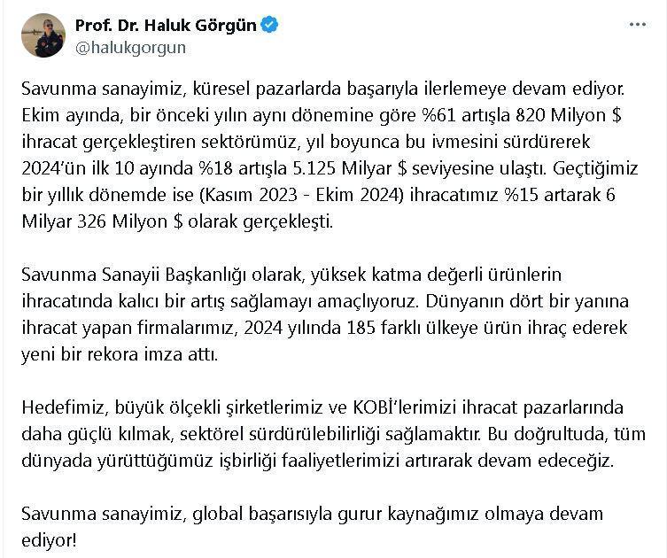 ANKARA, (DHA)-SAVUNMA Sanayii Başkanı Haluk Görgün, "Savunma sanayimiz, küresel pazarlarda başarıyla ilerlemeye devam ediyor. Ekim ayında, bir önceki yılın aynı dönemine göre yüzde 61 artışla 820 milyon dolar ihracat gerçekleştiren sektörümüz, yıl boyunca bu ivmesini sürdürerek 2024'ün ilk 10 ayında yüzde 18 artışla 5 milyar 125 milyon dolar seviyesine ulaştı" dedi.