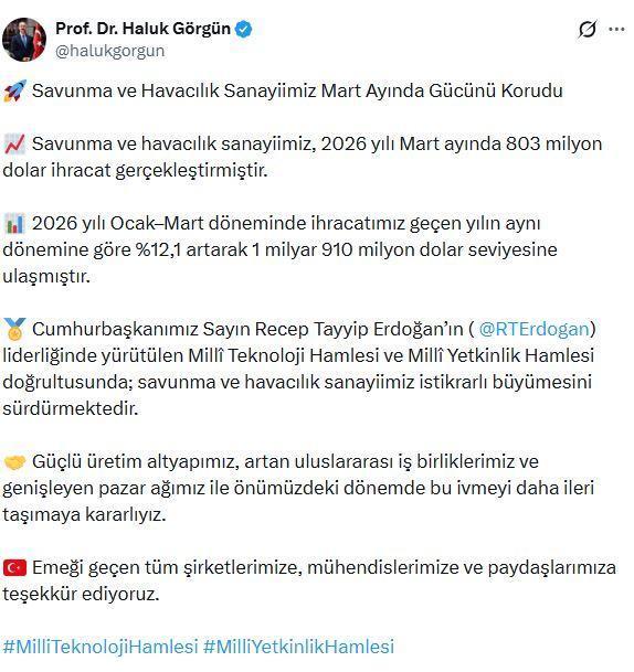ANKARA, (DHA)- SAVUNMA Sanayii Başkanı Haluk Görgün, "Savunma ve havacılık sanayiimiz, 2026 yılı Mart ayında 803 milyon dolar ihracat gerçekleştirmiştir" dedi.