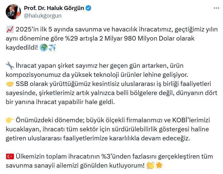 ANKARA, (DHA)- SAVUNMA Sanayii Başkanı Haluk Görgün, 2025’in ilk 5 ayında savunma ve havacılık ihracatının, geçen yılın aynı dönemine göre yüzde 29 artışla 2 milyar 980 milyon dolara çıktığını duyurdu.