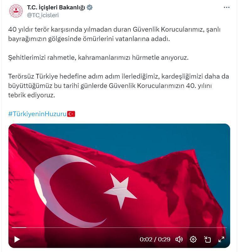 Bakanlığın sosyal medya hesabından yayımlanan mesajda, "40 yıldır terör karşısında yılmadan duran güvenlik korucularımız, şanlı bayrağımızın gölgesinde ömürlerini vatanlarına adadı. Şehitlerimizi rahmetle, kahramanlarımızı hürmetle anıyoruz. Terörsüz Türkiye hedefine adım adım ilerlediğimiz, kardeşliğimizi daha da büyüttüğümüz bu tarihi günlerde güvenlik korucularımızın 40'ıncı yılını tebrik ediyoruz" denildi. (DHA)
