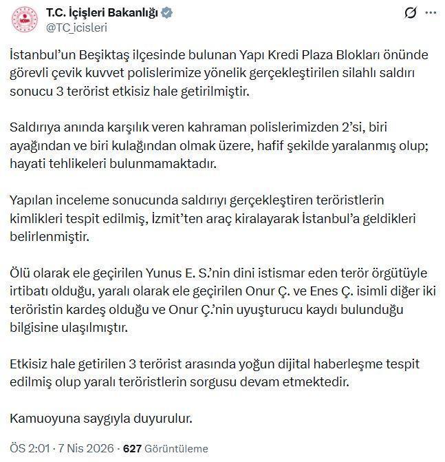 Bakanlığın sanal medya hesabından yapılan açıklamada, "İstanbul’un Beşiktaş ilçesinde bulunan Yapı Kredi Plaza Blokları önünde görevli çevik kuvvet polislerimize yönelik gerçekleştirilen silahlı saldırı sonucu 3 terörist etkisiz hale getirilmiştir. Saldırıya anında karşılık veren kahraman polislerimizden 2’si, biri ayağından ve biri kulağından olmak üzere, hafif şekilde yaralanmış olup; hayati tehlikeleri bulunmamaktadır. Yapılan inceleme sonucunda saldırıyı gerçekleştiren teröristlerin kimlikleri tespit edilmiş, İzmit’ten araç kiralayarak İstanbul’a geldikleri belirlenmiştir. Ölü olarak ele geçirilen Yunus E.S.’nin dini istismar eden terör örgütüyle irtibatı olduğu, yaralı olarak ele geçirilen Onur Ç. ve Enes Ç. isimli diğer 2 teröristin kardeş olduğu ve Onur Ç.’nin uyuşturucu kaydı bulunduğu bilgisine ulaşılmıştır. Etkisiz hale getirilen 3 terörist arasında yoğun dijital haberleşme tespit edilmiş olup yaralı teröristlerin sorgusu devam etmektedir" ifadelerine yer verildi. (DHA)