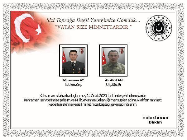 Milli Savunma Bakanı Hulusi Akar da şehit askerler için yayımladığı taziye mesajında, "Kahraman silah arkadaşlarımız 24 Ocak 2023 tarihinde şehit olmuşlardır. Kahraman şehitlerimize şahsım ve Milli Savunma Bakanlığı mensupları adına Allah'tan rahmet; kederli ailelerine ve asil milletimize başsağlığı ve sabır dilerim" dedi.