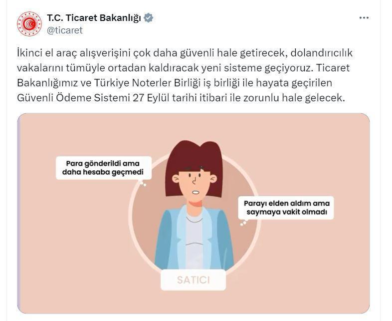 Bakanlığın sosyal medya hesabından yapılan açıklamada, "İkinci el araç alışverişini çok daha güvenli hale getirecek, dolandırıcılık vakalarını tümüyle ortadan kaldıracak yeni sisteme geçiyoruz. Ticaret Bakanlığımız ve Türkiye Noterler Birliği iş birliğiyle hayata geçirilen Güvenli Ödeme Sistemi 27 Eylül tarihi itibarıyla zorunlu hale gelecek" denildi. (DHA)