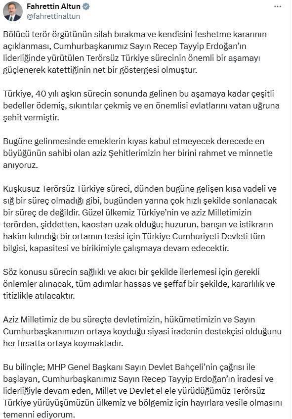 ANKARA, (DHA)- İLETİŞİM Başkanı Fahrettin Altun, "Bölücü terör örgütünün silah bırakma ve kendisini feshetme kararının açıklanması, Cumhurbaşkanımız Sayın Recep Tayyip Erdoğan’ın liderliğinde yürütülen 'Terörsüz Türkiye' sürecinin önemli bir aşamayı güçlenerek katettiğinin net bir göstergesi olmuştur" dedi.
