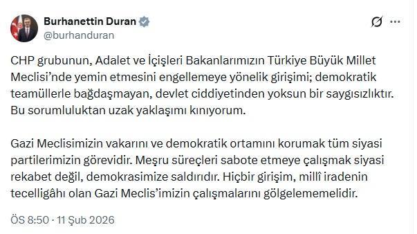 İletişim Başkanı Duran, sanal medya üzerinden yaptığı açıklamada, "CHP grubunun, Adalet ve İçişleri Bakanlarımızın Türkiye Büyük Millet Meclisi’nde yemin etmesini engellemeye yönelik girişimi; demokratik teamüllerle bağdaşmayan, devlet ciddiyetinden yoksun bir saygısızlıktır. Bu sorumluluktan uzak yaklaşımı kınıyorum. Gazi Meclisimizin vakarını ve demokratik ortamını korumak tüm siyasi partilerimizin görevidir. Meşru süreçleri sabote etmeye çalışmak siyasi rekabet değil, demokrasimize saldırıdır. Hiçbir girişim, millî iradenin tecelligahı olan Gazi Meclis’imizin çalışmalarını gölgelememelidir" ifadelerini kullandı. (DHA)